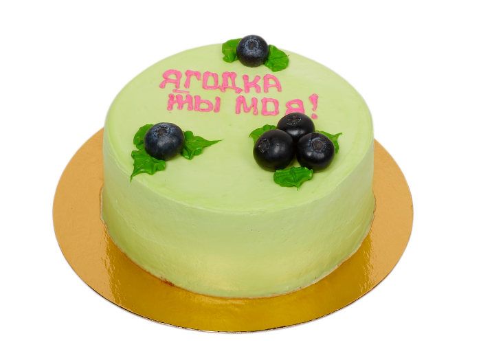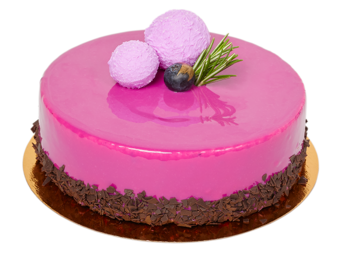 Три коржа белого воздушного бисквита пропитаны сиропом, поочередно соединены нежным Баварским кремом на основе натурального белого шоколада и сливок и фруктовой черничной начинкой со свежезамороженной черникой. Торт покрыт нежным сырным кремом и декорирован кондитерской глазурью в виде потёков, пирожным Макарон, свежей ароматной голубикой и веточками розмарина